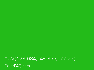 YUV 123.084,-48.355,-77.25 Color is a normal green color and the nearest color is Wageningen Green #34b233. Hex code #23bb19 and RGB value is rgb(35,187,25). In RGB color space, this color is composed of 14% red, 73% green, 10% blue, In CMYK color space, this color is composed of 81% cyan, 0% magenta, 87% yellow , 27% black , In HSL color space, this color has a hue angle of 116° , 76% saturation and 42% lightness.