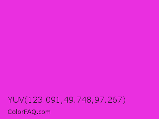 YUV 123.091,49.748,97.267 Color is a normal magenta color and the nearest color is Razzle Dazzle Rose #ff33cc. Hex code #ea2fe0 and RGB value is rgb(234,47,224). In RGB color space, this color is composed of 92% red, 18% green, 88% blue, In CMYK color space, this color is composed of 0% cyan, 80% magenta, 4% yellow , 8% black , In HSL color space, this color has a hue angle of 303° , 82% saturation and 55% lightness.
