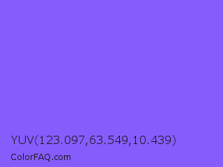 YUV 123.097,63.549,10.439 Color is a light indigo color and the nearest color is Navy Purple #9457eb. Hex code #875cfc and RGB value is rgb(135,92,252). In RGB color space, this color is composed of 53% red, 36% green, 99% blue, In CMYK color space, this color is composed of 46% cyan, 63% magenta, 0% yellow , 1% black , In HSL color space, this color has a hue angle of 256° , 96% saturation and 67% lightness.