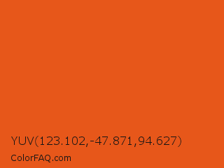 YUV 123.102,-47.871,94.627 Color is a normal orange color and the nearest color is Flame #e25822. Hex code #e7571a and RGB value is rgb(231,87,26). In RGB color space, this color is composed of 91% red, 34% green, 10% blue, In CMYK color space, this color is composed of 0% cyan, 62% magenta, 89% yellow , 9% black , In HSL color space, this color has a hue angle of 18° , 81% saturation and 50% lightness.