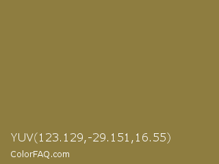 YUV 123.129,-29.151,16.55 Color is a normal yellow color and the nearest color is Old Moss Green #867e36. Hex code #8e7d40 and RGB value is rgb(142,125,64). In RGB color space, this color is composed of 56% red, 49% green, 25% blue, In CMYK color space, this color is composed of 0% cyan, 12% magenta, 55% yellow , 44% black , In HSL color space, this color has a hue angle of 47° , 38% saturation and 40% lightness.
