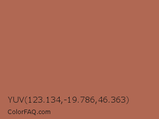 YUV 123.134,-19.786,46.363 Color is a normal red color and the nearest color is Santa Fe #b16d52. Hex code #b06853 and RGB value is rgb(176,104,83). In RGB color space, this color is composed of 69% red, 41% green, 33% blue, In CMYK color space, this color is composed of 0% cyan, 41% magenta, 53% yellow , 31% black , In HSL color space, this color has a hue angle of 14° , 37% saturation and 51% lightness.