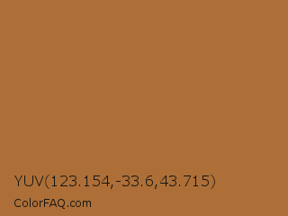 YUV 123.154,-33.6,43.715 Color is a normal orange color and the nearest color is Copper #b87333. Hex code #ad6f37 and RGB value is rgb(173,111,55). In RGB color space, this color is composed of 68% red, 44% green, 22% blue, In CMYK color space, this color is composed of 0% cyan, 36% magenta, 68% yellow , 32% black , In HSL color space, this color has a hue angle of 28° , 52% saturation and 45% lightness.