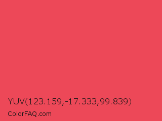 YUV 123.159,-17.333,99.839 Color is a light red color and the nearest color is Desire #ea3c53. Hex code #ed4858 and RGB value is rgb(237,72,88). In RGB color space, this color is composed of 93% red, 28% green, 35% blue, In CMYK color space, this color is composed of 0% cyan, 70% magenta, 63% yellow , 7% black , In HSL color space, this color has a hue angle of 354° , 82% saturation and 61% lightness.