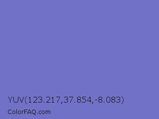 YUV 123.217,37.854,-8.083 Color is a light indigo color and the nearest color is Toolbox #746cc0. Hex code #7271c8 and RGB value is rgb(114,113,200). In RGB color space, this color is composed of 45% red, 44% green, 78% blue, In CMYK color space, this color is composed of 43% cyan, 44% magenta, 0% yellow , 22% black , In HSL color space, this color has a hue angle of 241° , 44% saturation and 61% lightness.