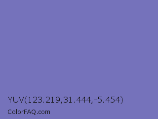 YUV 123.219,31.444,-5.454 Color is a normal indigo color and the nearest color is Toolbox #746cc0. Hex code #7572bb and RGB value is rgb(117,114,187). In RGB color space, this color is composed of 46% red, 45% green, 73% blue, In CMYK color space, this color is composed of 37% cyan, 39% magenta, 0% yellow , 27% black , In HSL color space, this color has a hue angle of 242° , 35% saturation and 59% lightness.