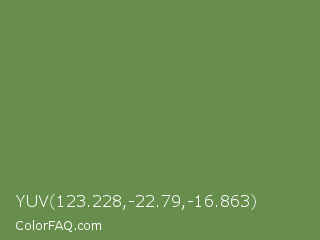 YUV 123.228,-22.79,-16.863 Color is a normal green color and the nearest color is Palm Leaf #6f9940. Hex code #688e4d and RGB value is rgb(104,142,77). In RGB color space, this color is composed of 41% red, 56% green, 30% blue, In CMYK color space, this color is composed of 27% cyan, 0% magenta, 46% yellow , 44% black , In HSL color space, this color has a hue angle of 95° , 30% saturation and 43% lightness.