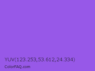 YUV 123.253,53.612,24.334 Color is a light violet color and the nearest color is Navy Purple #9457eb. Hex code #9758e8 and RGB value is rgb(151,88,232). In RGB color space, this color is composed of 59% red, 35% green, 91% blue, In CMYK color space, this color is composed of 35% cyan, 62% magenta, 0% yellow , 9% black , In HSL color space, this color has a hue angle of 266° , 76% saturation and 63% lightness.