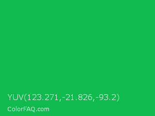 YUV 123.271,-21.826,-93.2 Color is a normal green color and the nearest color is Dark Pastel Green #03c03c. Hex code #11ba4f and RGB value is rgb(17,186,79). In RGB color space, this color is composed of 7% red, 73% green, 31% blue, In CMYK color space, this color is composed of 91% cyan, 0% magenta, 58% yellow , 27% black , In HSL color space, this color has a hue angle of 142° , 83% saturation and 40% lightness.