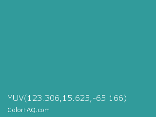 YUV 123.306,15.625,-65.166 Color is a normal cyan color and the nearest color is Zomp #39a78e. Hex code #319b9b and RGB value is rgb(49,155,155). In RGB color space, this color is composed of 19% red, 61% green, 61% blue, In CMYK color space, this color is composed of 68% cyan, 0% magenta, 0% yellow , 39% black , In HSL color space, this color has a hue angle of 180° , 52% saturation and 40% lightness.