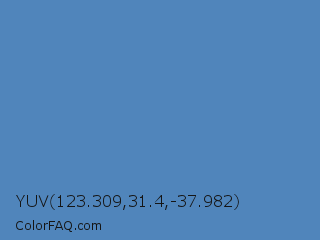 YUV 123.309,31.4,-37.982 Color is a normal blue color and the nearest color is Cyan Azure #4e82b4. Hex code #5085bb and RGB value is rgb(80,133,187). In RGB color space, this color is composed of 31% red, 52% green, 73% blue, In CMYK color space, this color is composed of 57% cyan, 29% magenta, 0% yellow , 27% black , In HSL color space, this color has a hue angle of 210° , 44% saturation and 52% lightness.