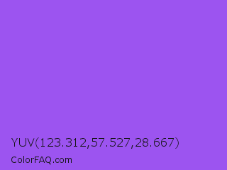 YUV 123.312,57.527,28.667 Color is a light violet color and the nearest color is Navy Purple #9457eb. Hex code #9c54f0 and RGB value is rgb(156,84,240). In RGB color space, this color is composed of 61% red, 33% green, 94% blue, In CMYK color space, this color is composed of 35% cyan, 65% magenta, 0% yellow , 6% black , In HSL color space, this color has a hue angle of 268° , 84% saturation and 64% lightness.