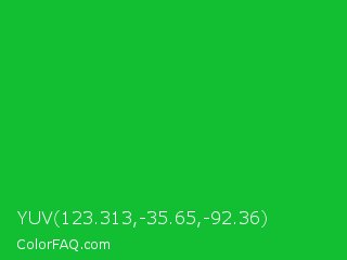 YUV 123.313,-35.65,-92.36 Color is a normal green color and the nearest color is Dark Pastel Green #03c03c. Hex code #12bf33 and RGB value is rgb(18,191,51). In RGB color space, this color is composed of 7% red, 75% green, 20% blue, In CMYK color space, this color is composed of 91% cyan, 0% magenta, 73% yellow , 25% black , In HSL color space, this color has a hue angle of 131° , 83% saturation and 41% lightness.