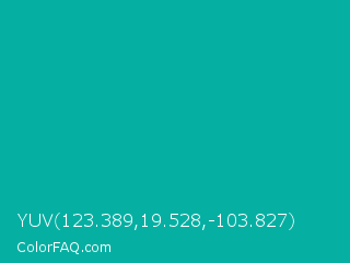 YUV 123.389,19.528,-103.827 Color is a normal cyan color and the nearest color is Persian Green #00a693. Hex code #05b0a3 and RGB value is rgb(5,176,163). In RGB color space, this color is composed of 2% red, 69% green, 64% blue, In CMYK color space, this color is composed of 97% cyan, 0% magenta, 7% yellow , 31% black , In HSL color space, this color has a hue angle of 175° , 94% saturation and 35% lightness.