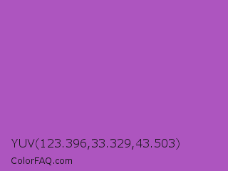 YUV 123.396,33.329,43.503 Color is a normal purple color and the nearest color is Purple Plum #9c51b6. Hex code #ad55bf and RGB value is rgb(173,85,191). In RGB color space, this color is composed of 68% red, 33% green, 75% blue, In CMYK color space, this color is composed of 9% cyan, 55% magenta, 0% yellow , 25% black , In HSL color space, this color has a hue angle of 290° , 45% saturation and 54% lightness.