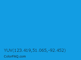 YUV 123.419,51.065,-92.452 Color is a normal blue color and the nearest color is Button Blue #24a0ed. Hex code #129de3 and RGB value is rgb(18,157,227). In RGB color space, this color is composed of 7% red, 62% green, 89% blue, In CMYK color space, this color is composed of 92% cyan, 31% magenta, 0% yellow , 11% black , In HSL color space, this color has a hue angle of 200° , 85% saturation and 48% lightness.