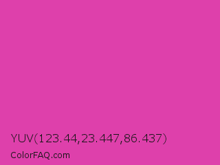 YUV 123.44,23.447,86.437 Color is a normal magenta color and the nearest color is Frostbite #e936a7. Hex code #de40ab and RGB value is rgb(222,64,171). In RGB color space, this color is composed of 87% red, 25% green, 67% blue, In CMYK color space, this color is composed of 0% cyan, 71% magenta, 23% yellow , 13% black , In HSL color space, this color has a hue angle of 319° , 71% saturation and 56% lightness.