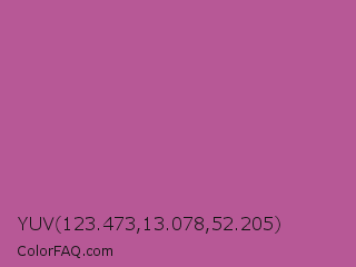 YUV 123.473,13.078,52.205 Color is a normal magenta color and the nearest color is Pearly Purple #b768a2. Hex code #b75896 and RGB value is rgb(183,88,150). In RGB color space, this color is composed of 72% red, 35% green, 59% blue, In CMYK color space, this color is composed of 0% cyan, 52% magenta, 18% yellow , 28% black , In HSL color space, this color has a hue angle of 321° , 40% saturation and 53% lightness.