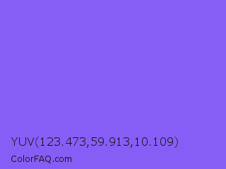 YUV 123.473,59.913,10.109 Color is a light indigo color and the nearest color is Medium Slate Blue #7b68ee. Hex code #875ef5 and RGB value is rgb(135,94,245). In RGB color space, this color is composed of 53% red, 37% green, 96% blue, In CMYK color space, this color is composed of 45% cyan, 62% magenta, 0% yellow , 4% black , In HSL color space, this color has a hue angle of 256° , 88% saturation and 66% lightness.