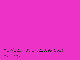 YUV 123.486,37.228,99.552 Color is a normal magenta color and the nearest color is Razzle Dazzle Rose #ff33cc. Hex code #ed33c7 and RGB value is rgb(237,51,199). In RGB color space, this color is composed of 93% red, 20% green, 78% blue, In CMYK color space, this color is composed of 0% cyan, 78% magenta, 16% yellow , 7% black , In HSL color space, this color has a hue angle of 312° , 84% saturation and 56% lightness.