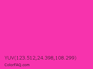 YUV 123.512,24.398,108.299 Color is a normal magenta color and the nearest color is Frostbite #e936a7. Hex code #f733ad and RGB value is rgb(247,51,173). In RGB color space, this color is composed of 97% red, 20% green, 68% blue, In CMYK color space, this color is composed of 0% cyan, 79% magenta, 30% yellow , 3% black , In HSL color space, this color has a hue angle of 323° , 92% saturation and 58% lightness.