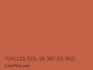 YUV 123.523,-26.387,63.562 Color is a normal red color and the nearest color is Cedar Chest #c95a49. Hex code #c46146 and RGB value is rgb(196,97,70). In RGB color space, this color is composed of 77% red, 38% green, 27% blue, In CMYK color space, this color is composed of 0% cyan, 51% magenta, 64% yellow , 23% black , In HSL color space, this color has a hue angle of 13° , 52% saturation and 52% lightness.