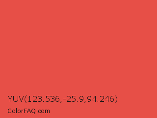 YUV 123.536,-25.9,94.246 Color is a normal red color and the nearest color is Carmine Pink #eb4c42. Hex code #e74f47 and RGB value is rgb(231,79,71). In RGB color space, this color is composed of 91% red, 31% green, 28% blue, In CMYK color space, this color is composed of 0% cyan, 66% magenta, 69% yellow , 9% black , In HSL color space, this color has a hue angle of 3° , 77% saturation and 59% lightness.