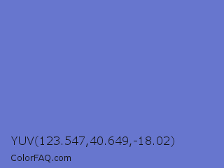 YUV 123.547,40.649,-18.02 Color is a light blue color and the nearest color is Toolbox #746cc0. Hex code #6776ce and RGB value is rgb(103,118,206). In RGB color space, this color is composed of 40% red, 46% green, 81% blue, In CMYK color space, this color is composed of 50% cyan, 43% magenta, 0% yellow , 19% black , In HSL color space, this color has a hue angle of 231° , 51% saturation and 61% lightness.