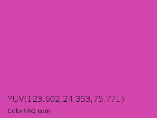 YUV 123.602,24.353,75.771 Color is a normal magenta color and the nearest color is Pink Pantone #d74894. Hex code #d246ad and RGB value is rgb(210,70,173). In RGB color space, this color is composed of 82% red, 27% green, 68% blue, In CMYK color space, this color is composed of 0% cyan, 67% magenta, 18% yellow , 18% black , In HSL color space, this color has a hue angle of 316° , 61% saturation and 55% lightness.