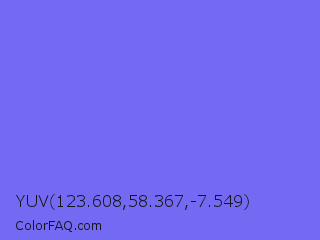 YUV 123.608,58.367,-7.549 Color is a light indigo color and the nearest color is Medium Slate Blue #7b68ee. Hex code #7369f2 and RGB value is rgb(115,105,242). In RGB color space, this color is composed of 45% red, 41% green, 95% blue, In CMYK color space, this color is composed of 52% cyan, 57% magenta, 0% yellow , 5% black , In HSL color space, this color has a hue angle of 244° , 84% saturation and 68% lightness.