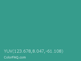 YUV 123.678,8.047,-61.108 Color is a normal cyan color and the nearest color is Zomp #39a78e. Hex code #369c8c and RGB value is rgb(54,156,140). In RGB color space, this color is composed of 21% red, 61% green, 55% blue, In CMYK color space, this color is composed of 65% cyan, 0% magenta, 10% yellow , 39% black , In HSL color space, this color has a hue angle of 171° , 49% saturation and 41% lightness.