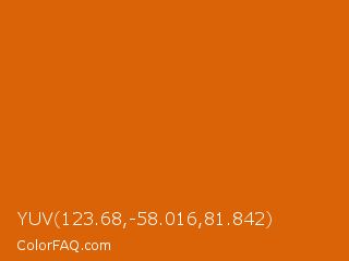 YUV 123.68,-58.016,81.842 Color is a normal orange color and the nearest color is Bamboo #da6304. Hex code #d96306 and RGB value is rgb(217,99,6). In RGB color space, this color is composed of 85% red, 39% green, 2% blue, In CMYK color space, this color is composed of 0% cyan, 54% magenta, 97% yellow , 15% black , In HSL color space, this color has a hue angle of 26° , 95% saturation and 44% lightness.