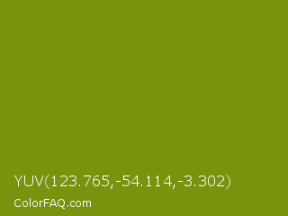 YUV 123.765,-54.114,-3.302 Color is a normal lime color and the nearest color is Trendy Green #7c881a. Hex code #78930e and RGB value is rgb(120,147,14). In RGB color space, this color is composed of 47% red, 58% green, 5% blue, In CMYK color space, this color is composed of 18% cyan, 0% magenta, 90% yellow , 42% black , In HSL color space, this color has a hue angle of 72° , 83% saturation and 32% lightness.