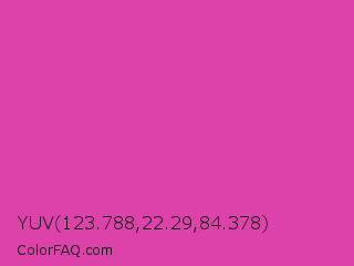 YUV 123.788,22.29,84.378 Color is a normal magenta color and the nearest color is Frostbite #e936a7. Hex code #dc42a9 and RGB value is rgb(220,66,169). In RGB color space, this color is composed of 86% red, 26% green, 66% blue, In CMYK color space, this color is composed of 0% cyan, 70% magenta, 23% yellow , 14% black , In HSL color space, this color has a hue angle of 320° , 69% saturation and 56% lightness.