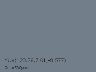 YUV 123.78,7.01,-8.577 Color is a normal blue color and the nearest color is Raven #727b89. Hex code #727e8a and RGB value is rgb(114,126,138). In RGB color space, this color is composed of 45% red, 49% green, 54% blue, In CMYK color space, this color is composed of 17% cyan, 9% magenta, 0% yellow , 46% black , In HSL color space, this color has a hue angle of 210° , 10% saturation and 49% lightness.