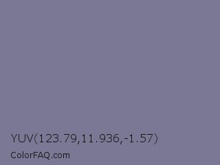 YUV 123.79,11.936,-1.57 Color is a normal indigo color and the nearest color is Rhythm #777696. Hex code #7a7894 and RGB value is rgb(122,120,148). In RGB color space, this color is composed of 48% red, 47% green, 58% blue, In CMYK color space, this color is composed of 18% cyan, 19% magenta, 0% yellow , 42% black , In HSL color space, this color has a hue angle of 244° , 12% saturation and 53% lightness.