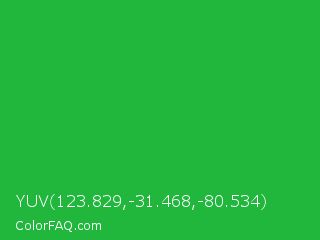 YUV 123.829,-31.468,-80.534 Color is a normal green color and the nearest color is Wageningen Green #34b233. Hex code #20b73c and RGB value is rgb(32,183,60). In RGB color space, this color is composed of 13% red, 72% green, 24% blue, In CMYK color space, this color is composed of 83% cyan, 0% magenta, 67% yellow , 28% black , In HSL color space, this color has a hue angle of 131° , 70% saturation and 42% lightness.