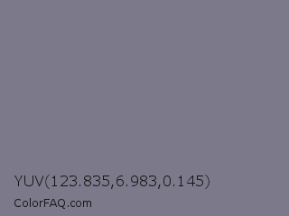 YUV 123.835,6.983,0.145 Color is a normal indigo color and the nearest color is Topaz #7c778a. Hex code #7c798a and RGB value is rgb(124,121,138). In RGB color space, this color is composed of 49% red, 47% green, 54% blue, In CMYK color space, this color is composed of 10% cyan, 12% magenta, 0% yellow , 46% black , In HSL color space, this color has a hue angle of 251° , 7% saturation and 51% lightness.