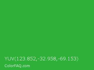 YUV 123.852,-32.958,-69.153 Color is a normal green color and the nearest color is Wageningen Green #34b233. Hex code #2db139 and RGB value is rgb(45,177,57). In RGB color space, this color is composed of 18% red, 69% green, 22% blue, In CMYK color space, this color is composed of 75% cyan, 0% magenta, 68% yellow , 31% black , In HSL color space, this color has a hue angle of 125° , 59% saturation and 44% lightness.