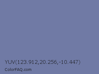 YUV 123.912,20.256,-10.447 Color is a normal blue color and the nearest color is Lynch #697e9a. Hex code #707aa5 and RGB value is rgb(112,122,165). In RGB color space, this color is composed of 44% red, 48% green, 65% blue, In CMYK color space, this color is composed of 32% cyan, 26% magenta, 0% yellow , 35% black , In HSL color space, this color has a hue angle of 229° , 23% saturation and 54% lightness.