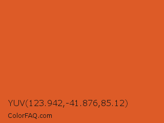YUV 123.942,-41.876,85.12 Color is a normal orange color and the nearest color is Vivid Red Tangelo #df6124. Hex code #dd5b27 and RGB value is rgb(221,91,39). In RGB color space, this color is composed of 87% red, 36% green, 15% blue, In CMYK color space, this color is composed of 0% cyan, 59% magenta, 82% yellow , 13% black , In HSL color space, this color has a hue angle of 17° , 73% saturation and 51% lightness.