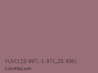 YUV 123.997,-1.971,25.436 Color is a normal red color and the nearest color is Bazaar #98777b. Hex code #996e78 and RGB value is rgb(153,110,120). In RGB color space, this color is composed of 60% red, 43% green, 47% blue, In CMYK color space, this color is composed of 0% cyan, 28% magenta, 22% yellow , 40% black , In HSL color space, this color has a hue angle of 346° , 17% saturation and 52% lightness.