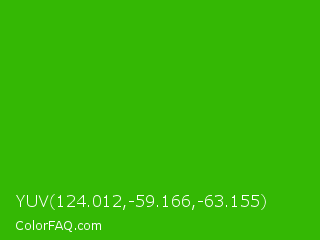 YUV 124.012,-59.166,-63.155 Color is a normal green color and the nearest color is Kelly Green #4cbb17. Hex code #34b804 and RGB value is rgb(52,184,4). In RGB color space, this color is composed of 20% red, 72% green, 2% blue, In CMYK color space, this color is composed of 72% cyan, 0% magenta, 98% yellow , 28% black , In HSL color space, this color has a hue angle of 104° , 96% saturation and 37% lightness.