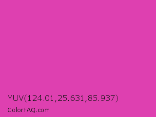 YUV 124.01,25.631,85.937 Color is a normal magenta color and the nearest color is Frostbite #e936a7. Hex code #de40b0 and RGB value is rgb(222,64,176). In RGB color space, this color is composed of 87% red, 25% green, 69% blue, In CMYK color space, this color is composed of 0% cyan, 71% magenta, 21% yellow , 13% black , In HSL color space, this color has a hue angle of 317° , 71% saturation and 56% lightness.