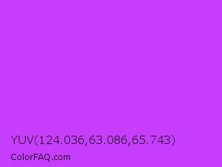 YUV 124.036,63.086,65.743 Color is a light purple color and the nearest color is Medium Orchid #ba55d3. Hex code #c73dfc and RGB value is rgb(199,61,252). In RGB color space, this color is composed of 78% red, 24% green, 99% blue, In CMYK color space, this color is composed of 21% cyan, 76% magenta, 0% yellow , 1% black , In HSL color space, this color has a hue angle of 283° , 97% saturation and 61% lightness.