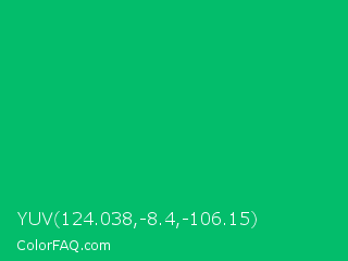 YUV 124.038,-8.4,-106.15 Color is a normal green color and the nearest color is GO Green #00ab66. Hex code #03bd6b and RGB value is rgb(3,189,107). In RGB color space, this color is composed of 1% red, 74% green, 42% blue, In CMYK color space, this color is composed of 98% cyan, 0% magenta, 43% yellow , 26% black , In HSL color space, this color has a hue angle of 154° , 97% saturation and 38% lightness.