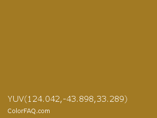 YUV 124.042,-43.898,33.289 Color is a normal orange color and the nearest color is Reef Gold #9f821c. Hex code #a27a23 and RGB value is rgb(162,122,35). In RGB color space, this color is composed of 64% red, 48% green, 14% blue, In CMYK color space, this color is composed of 0% cyan, 25% magenta, 78% yellow , 36% black , In HSL color space, this color has a hue angle of 41° , 64% saturation and 39% lightness.