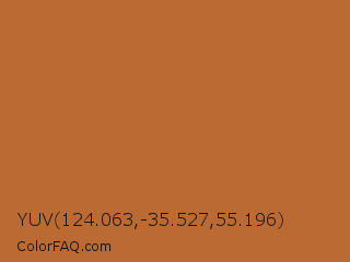 YUV 124.063,-35.527,55.196 Color is a normal orange color and the nearest color is Copper #b87333. Hex code #bb6a34 and RGB value is rgb(187,106,52). In RGB color space, this color is composed of 73% red, 42% green, 20% blue, In CMYK color space, this color is composed of 0% cyan, 43% magenta, 72% yellow , 27% black , In HSL color space, this color has a hue angle of 24° , 56% saturation and 47% lightness.