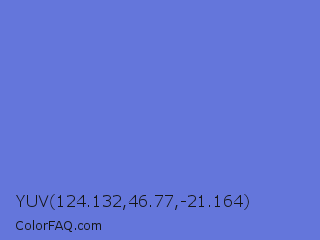 YUV 124.132,46.77,-21.164 Color is a light blue color and the nearest color is Moody Blue #7f76d3. Hex code #6476db and RGB value is rgb(100,118,219). In RGB color space, this color is composed of 39% red, 46% green, 86% blue, In CMYK color space, this color is composed of 54% cyan, 46% magenta, 0% yellow , 14% black , In HSL color space, this color has a hue angle of 231° , 62% saturation and 63% lightness.