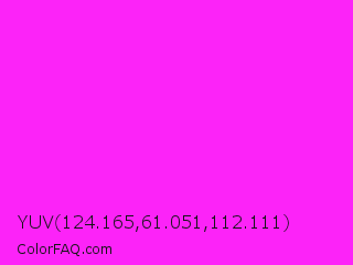 YUV 124.165,61.051,112.111 Color is a normal magenta color and the nearest color is Magenta / Fuchsia #ff00ff. Hex code #fc23f8 and RGB value is rgb(252,35,248). In RGB color space, this color is composed of 99% red, 14% green, 97% blue, In CMYK color space, this color is composed of 0% cyan, 86% magenta, 2% yellow , 1% black , In HSL color space, this color has a hue angle of 301° , 97% saturation and 56% lightness.